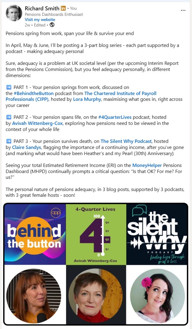 In addition, in April, May and June 2026, I’m blogging and podcasting about adequacy, across work, life and death – here’s my LinkedIn post trailing the series: