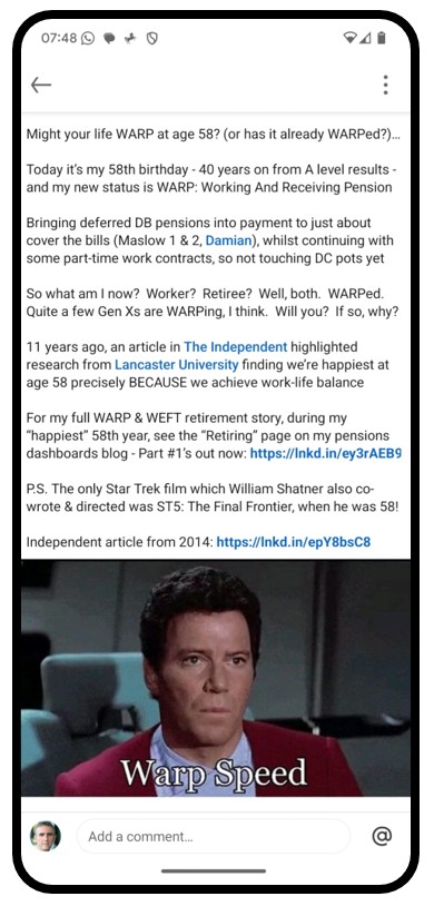 Therefore, from August 2025, I’m going to be Working And Receiving Pension – I’m going to WARP!