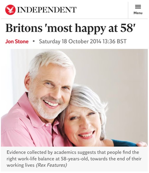The academics found it’s the good work-life balance which 58-year-olds (like me) are able to strike that makes them the happiest of all UK age groups.