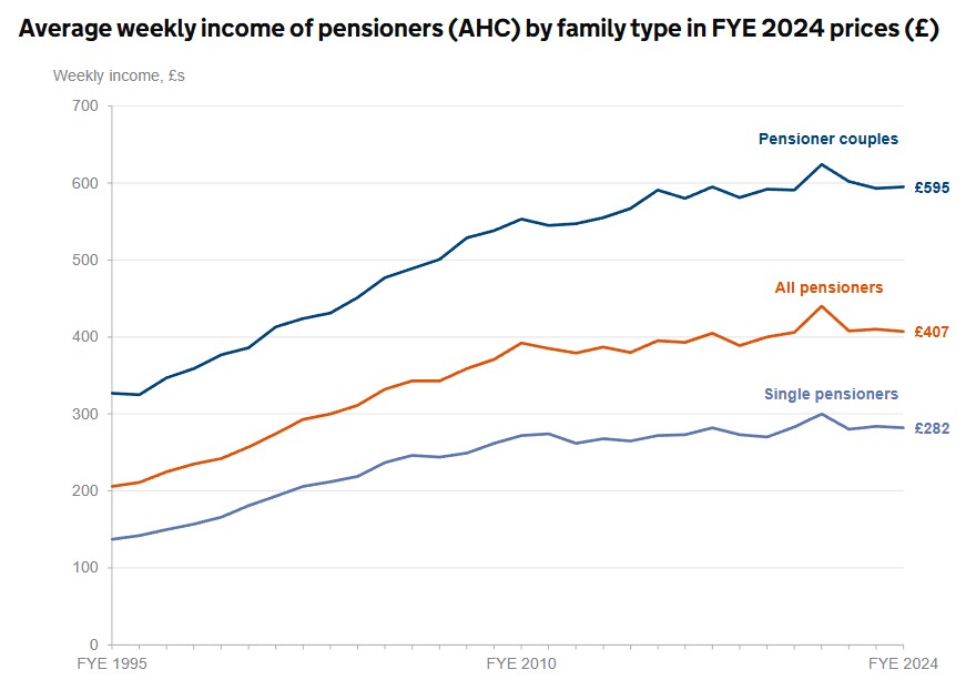 After the deduction of direct taxes, and housing costs, the average income of all pensioners in 2024 was £407 a week, or £407 x 52 = £21,164 a year.
