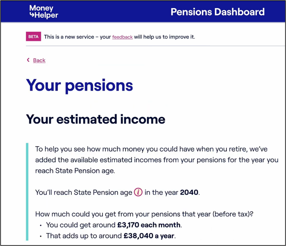 Crucially, dashboards lead with the consumer’s total Estimated Retirement Income (ERI), i.e. the rough total amount of regular income (shown as both monthly and yearly amounts) that the user might be able to receive during their retirement from their State Pension age.