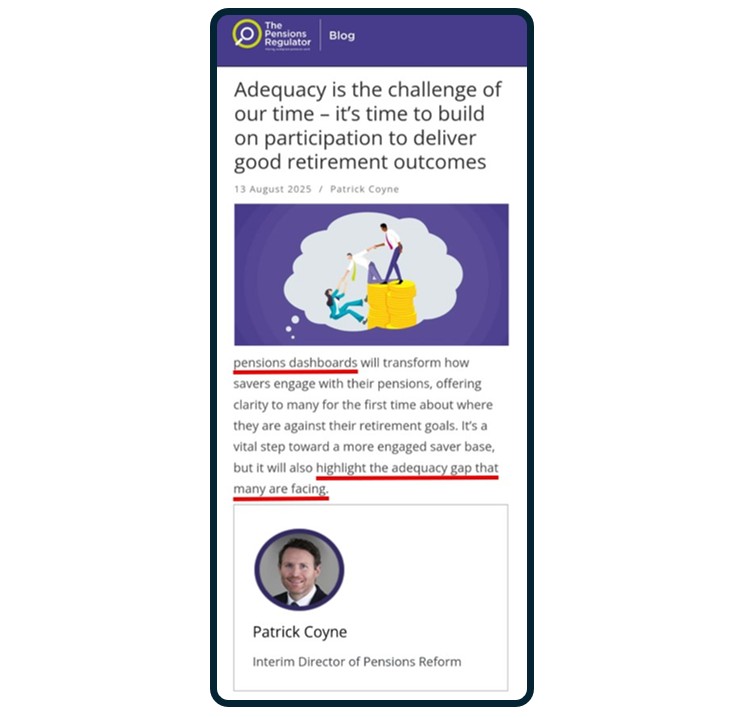 One rare exception was an August 2025 blog by TPR’s Patrick Coyne in which he said: “pensions dashboards … highlight the adequacy gap that many are facing”.