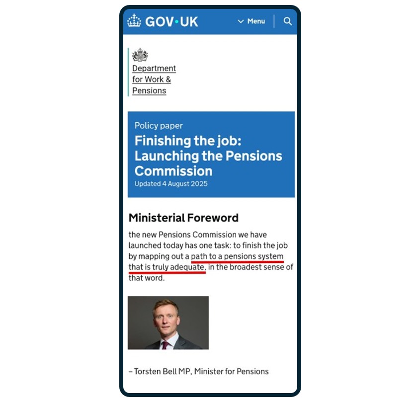 Minister for Pensions, Torsten Bell MP, said in July 2025: “The new Pensions Commission has one task: to finish the job by mapping out a path to a pensions system that is truly adequate, in the broadest sense of that word.”