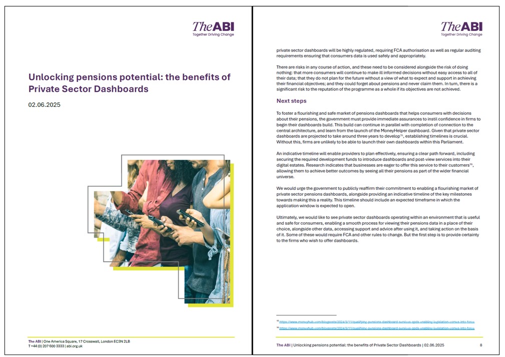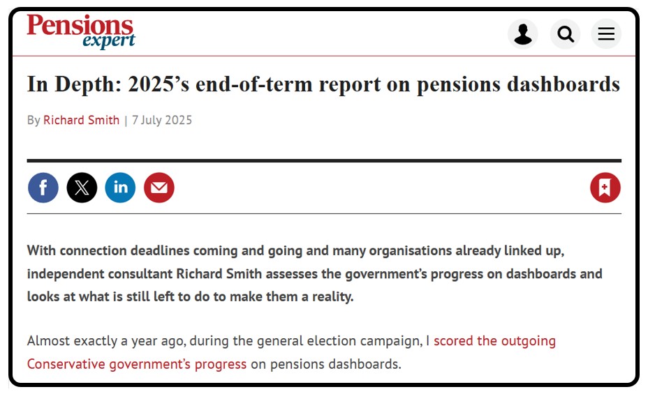 An FCA press release announces consultation CP25/17 (closing at the end of August) on its targeted support proposals and draft Handbook Rules. There’s just one mention of dashboards, in paragraph 2.96 on page 36: “The information pensions dashboard services make available to consumers could help identify if a consumer matches a consumer segment”.