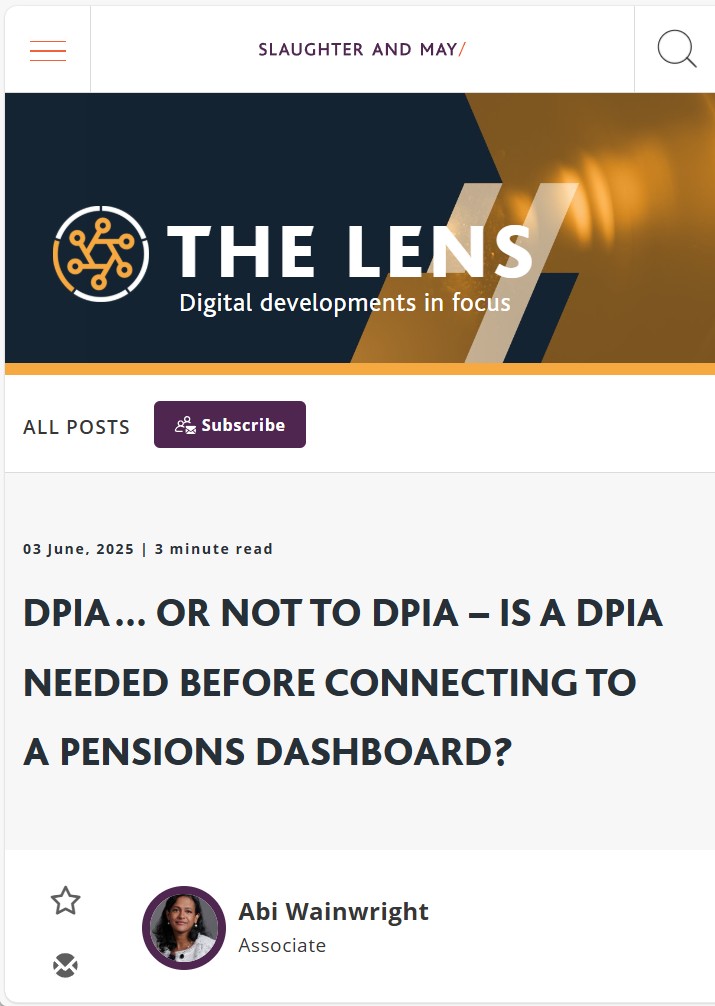 Slaughter & May’s Abi Wainwright publishes a helpful blog article article on the requirements for data providers connecting the dashboards ecosystem to complete a Data Protection Impact Assessment (DPIA).