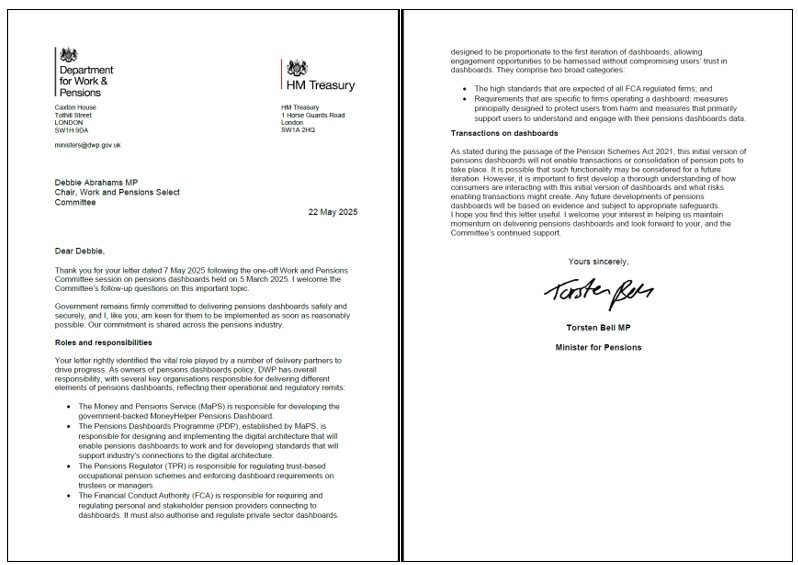 Chair of the Work and Pensions Committee Debbie Abrahams MP sends a letter with 15 questions on the delivery of dashboards to Minister for Pensions (MfP) Torsten Bell MP, published on the WPC Correspondence page, and requesting a reply by 21 May.