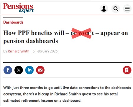 2024 ended with a PensionsAge article and 2025 (the twelfth year of this blog) starts with another one: pension firm Cartwright advises scheme trustees to consider the pros and cons of having to connect to the dashboards ecosystem for just a relatively short time before the scheme is, for example, bought out (after which the buy-out provider would then take over responsibility for connecting to the ecosystem).