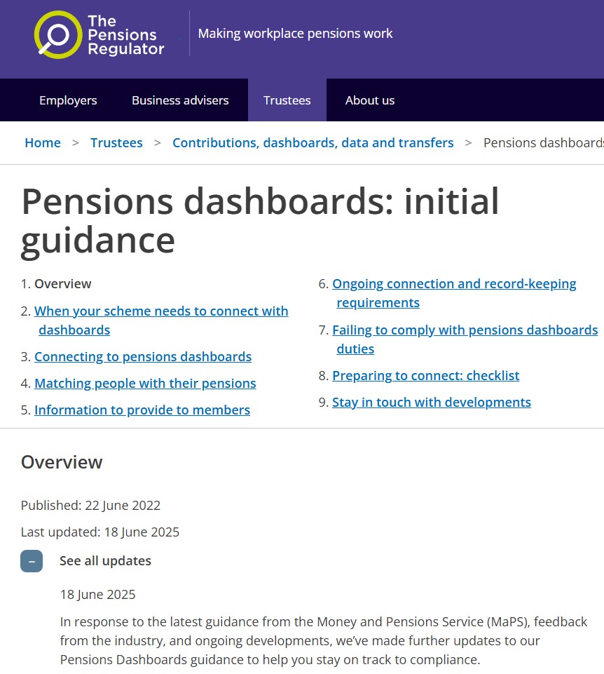 The Pensions Regulator (TPR) updates it guidance for pensions schemes on connecting to the dashboards ecosystem (nearly 3 years since its original publication).