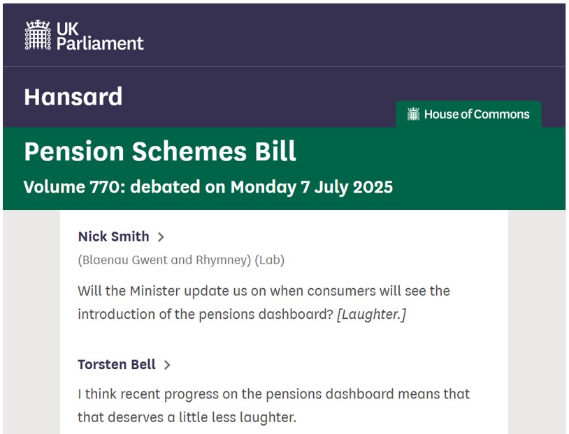 Pensions dashboards are mentioned several times during the Commons Second Reading of the Pension Schemes Bill, including the humorous exchange below: