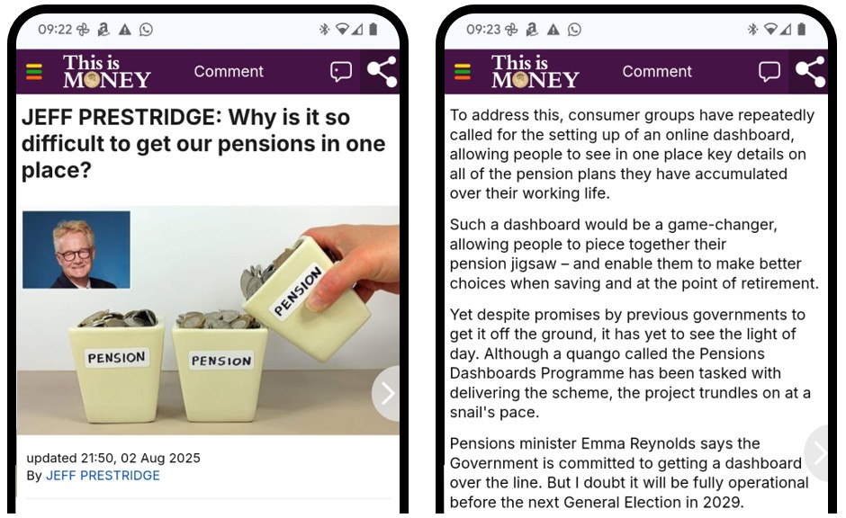 A This is Money article, by The Mail’s Personal Finance Editor Jeff Prestridge, explains how dashboards are “a game-changer”, but also how he doubts they will “be fully operational by the next General Election in 2029”.