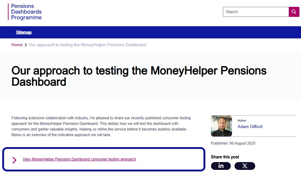 A blog article from MaPS’s Adam Gifford outlines their approach for testing the MoneyHelper Pensions Dashboard (MHPD), with a link to the full approach.