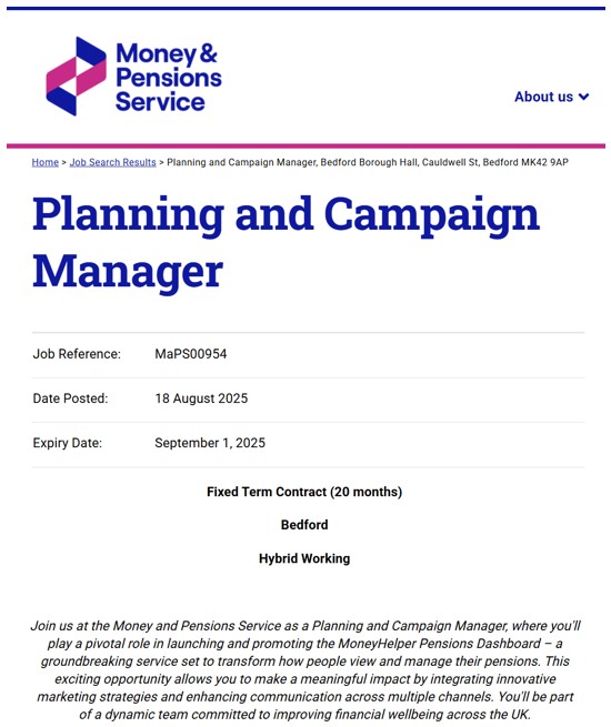MaPS advertises, on a 20 month fixed term contract, for a Planning and Campaign Manager to “play a pivotal role in launching and promoting the MoneyHelper Pensions Dashboard” (MHPD).