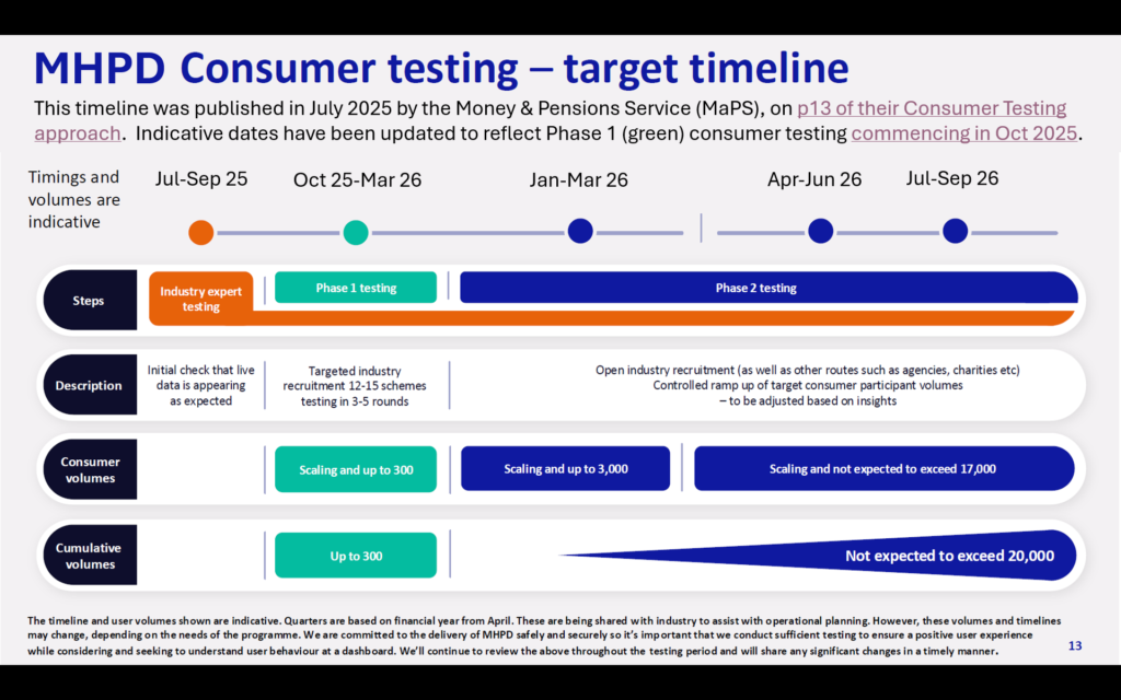 If Consumer testing concludes successfully in Autumn 2026, the 6-month MHLN (MoneyHelper Launch Notice) may be published by Christmas 2026, suggesting an MHLD (MoneyHelper Launch Date) in Summer 2027. But it all depends on how well the Consumer testing goes.