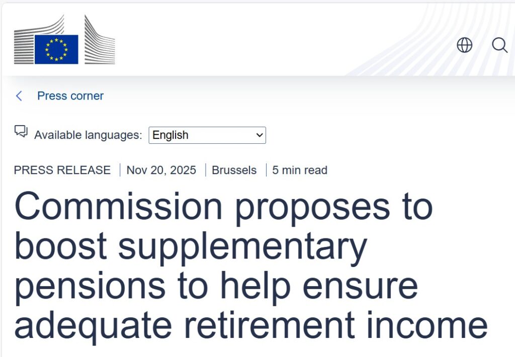 Finally, announced in a November 2025 press release (and an associated Q&As), the European Commission adopts a package of measures to help citizens secure an adequate retirement income by improving access to better and more effective supplementary pensions.